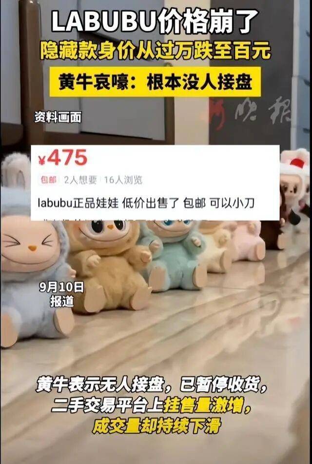 二手平台上,“亏本出”、“打包清仓”、“求回血”的帖子随处可见。一位资深黄牛余女士向记者哭诉:“我从事潮玩转手已经两年了,LABUBU一直是硬通货。但这次市场反应完全出乎意料,我手里还压着三整端没有出手,估计要亏好几千。”社交平台上,黄牛们纷纷发文:“LABUBU系列暂停收货,全盘系列大跌价,等待牛市回归。”