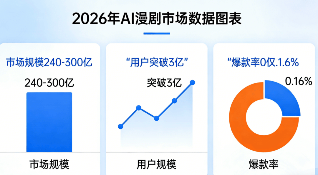 数据不会说谎:2026年国内AI漫剧市场规模预计达240-300亿元,同比增长40%-80%;用户规模突破2.8-3亿,日活峰值高达3000万,Z世代主导的碎片化消费习惯,让短平快的AI漫剧成为刚需。