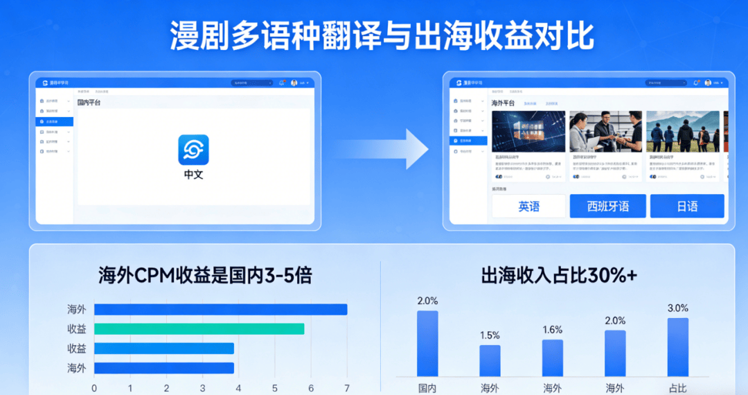 2026年全球短剧出海市场规模达60-90亿美元,中企占90%份额,AI一键多语种适配,让海外CPM收益达国内3-5倍,出海收入占比有望提升至30%+。